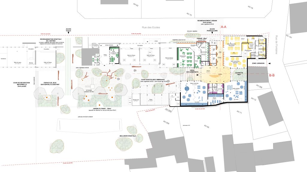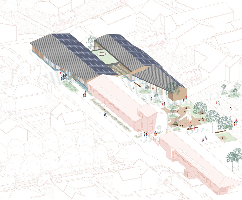 Restructuration de l’école élémentaire et du pôle périscolaire de Daix (21) /// Lauréat du concours de maîtrise d’œuvre. ![]() Au vu de la densité du programme et de la surface du terrain, les nouvelles constructions viennent redessiner les limites de propriété en s’y implantant. Le projet vient donc se tourner vers le cœur de la parcelle et évite tout vis-à-vis avec les propriétés voisines. Les volumétries des nouvelles constructions restent à l’échelle des édifices environnants. Ce sont des volumes assez bas, toiture à double pente en zinc, structure hybride mêlant ossature/charpente bois et maçonnerie, avec toiture terrasse pour l’atrium central. Les murs sont enduits en limite de propriété et revêtus d’un bardage bois thermochauffé en façade sur rue, cour et patio, finition qui lui permet de conserver son aspect. ![]() Le premier volume longitudinal prend place le long de la Rue des Écoles et permet d’apporter les améliorations fonctionnelles attendues de l’école élémentaire, de créer l’espace et le pôle accueil, avec vestiaires, sanitaires et lave-mains, ainsi que la restauration et sa zone de service qui aura son propre accès Rue de Fontaine. ![]() L’atrium, espace central du projet est un pivot multifonctionnel dans l’organisation spatiale. L’âme du lieu, ‘la place du village’, lien entre intérieur et extérieur, carrefour d’échanges et d’événements, point de rencontre aussi bien pour les parents venant depuis le pôle accueil, que pour les enfants venant de la cour et des salles d’activités et de restauration. Il a l’avantage de supprimer les longues circulations et de créer une proximité directe et une facilité de distribution évidente des espaces pour l’ensemble des futurs usagers en plus de leur offrir une multitude d’opportunités d’appropriations. Maîtrise d’Œuvre :